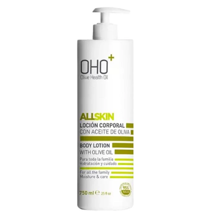 ALL SKIN Loción Corporal ligera formulada con Aceite de Oliva OHO, alantoína, D-pantenol y manteca de karité para todo tipo de pieles, incluso pieles sensibles.