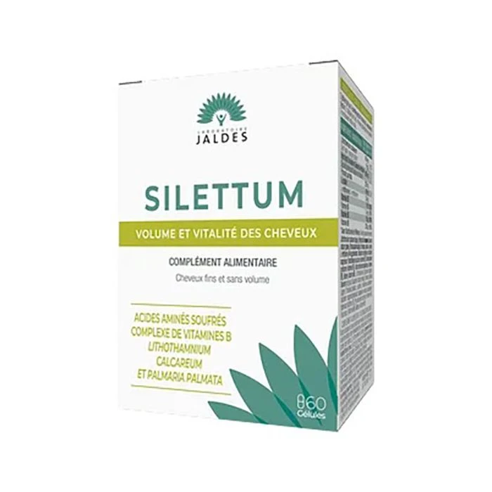 Silettum de Jaldes es un complemento alimenticio formulado para aportar belleza, vitalidad y volumen a tu cabello, a base de silicio marino de algas (Lithothamnium calcareum y Palmaria palmata), aminoácidos azufrados y vitaminas B.